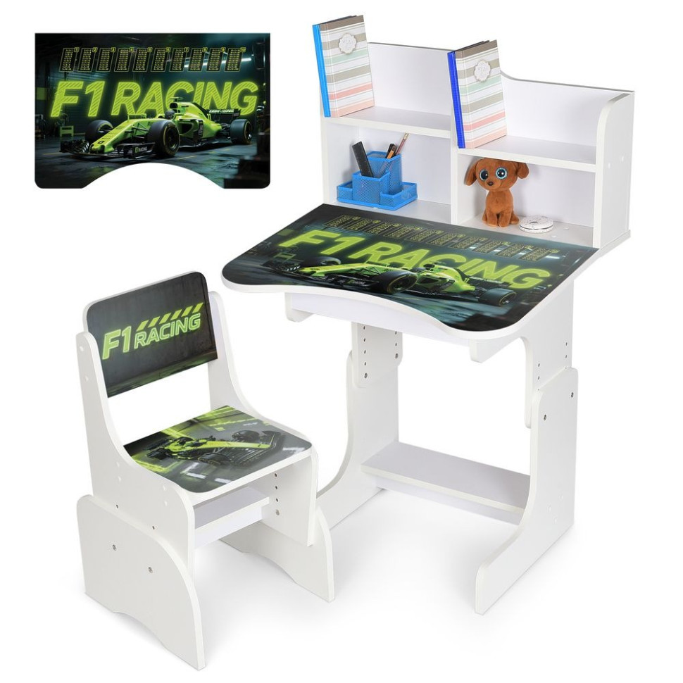 Парта N 2071 ідеальне рішення для маленьких школярів і дошкільнят. Комплект включає компактний дерев'яний стільчик з трьома рівнями регулювання висоти, що забезпечує правильну посадку дитини на різних етапах росту. На парті зображена українська абетка, що сприяє легкому вивченню букв під час занять.