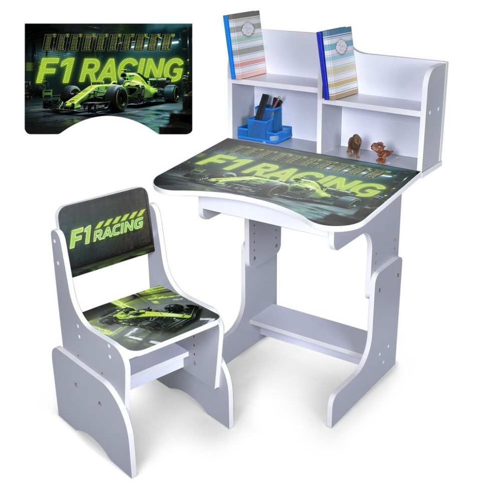 Парта N 2071 ідеальне рішення для маленьких школярів і дошкільнят. Комплект включає компактний дерев'яний стільчик з трьома рівнями регулювання висоти, що забезпечує правильну посадку дитини на різних етапах росту. На парті зображена українська абетка, що сприяє легкому вивченню букв під час занять.