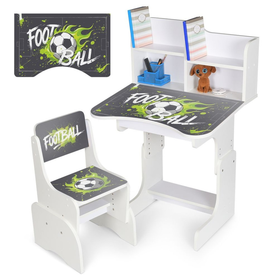 Парта N 2071 ідеальне рішення для маленьких школярів і дошкільнят. Комплект включає компактний дерев'яний стільчик з трьома рівнями регулювання висоти, що забезпечує правильну посадку дитини на різних етапах росту. На парті зображена українська абетка, що сприяє легкому вивченню букв під час занять.
